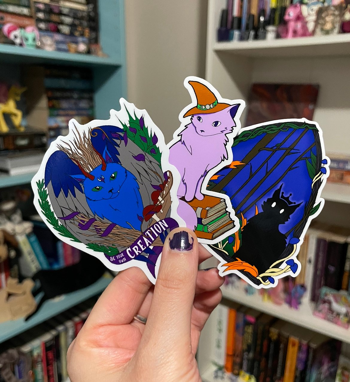 Three sticker designs for a discounted rate. All cats. All die-cut. One is of a witch cat sitting on books, one is of a magical cat that says “be your own creation”, and the third is of a portal to a fantasy world ruled by a cat.