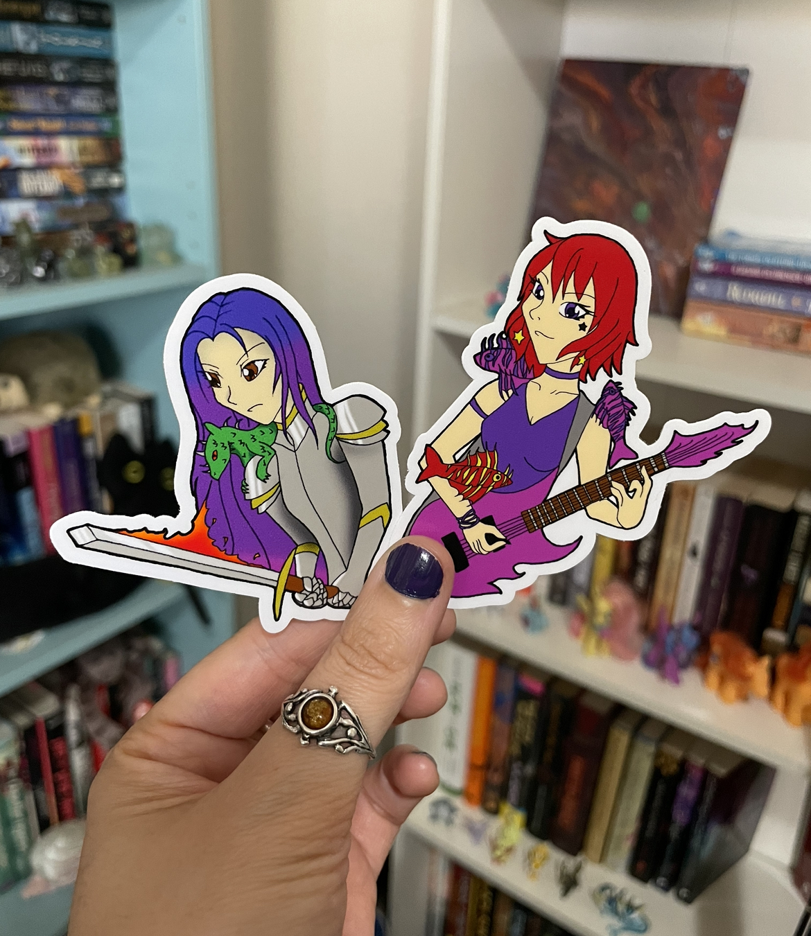 Two stickers included: one of a guitar player with lion fish, and one of a knight with her trusty dragon companion turning her sword into a fire sword.