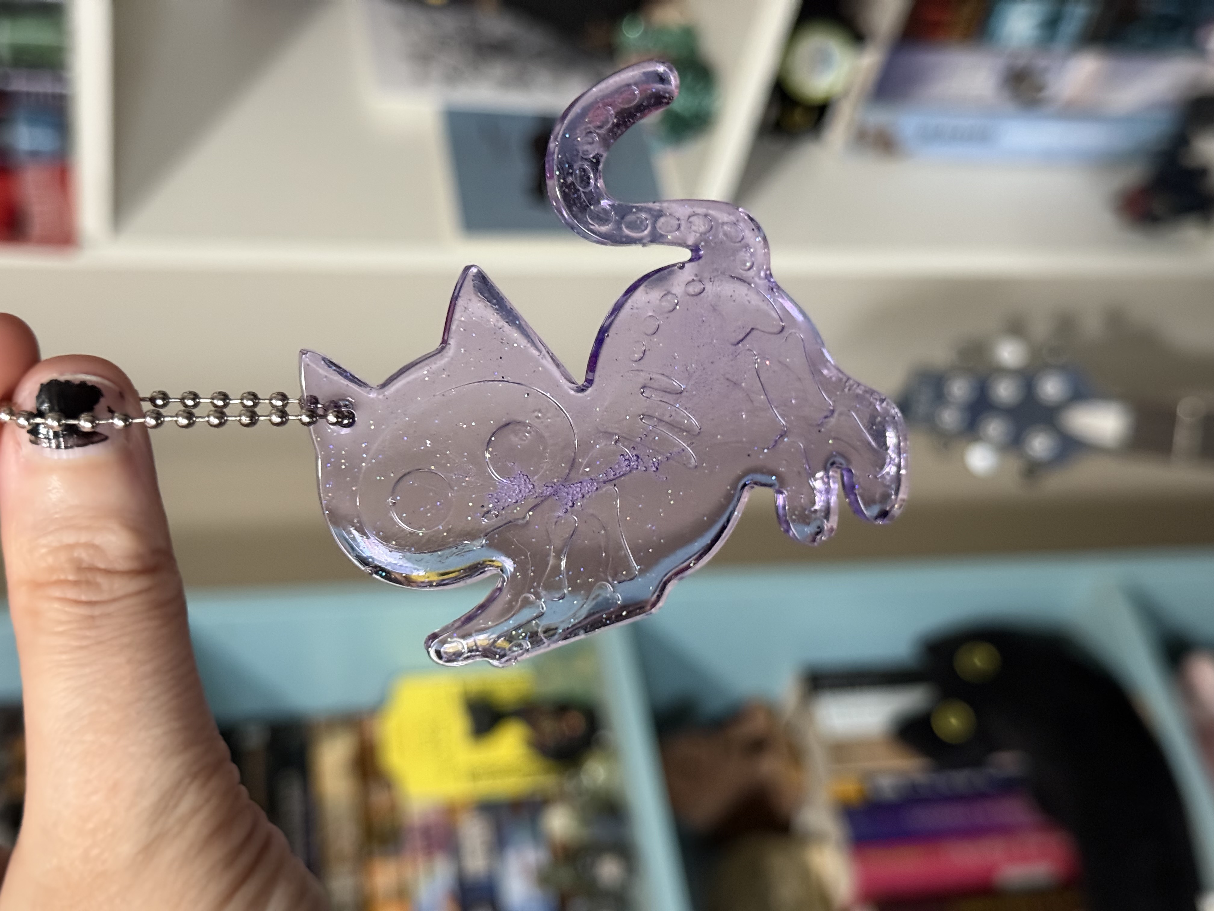 This keychain looks cat shaped, but don’t be fooled, it has a subtle skeleton cat design on it too. Handmade from resin, and perfect for hanging on your bag.