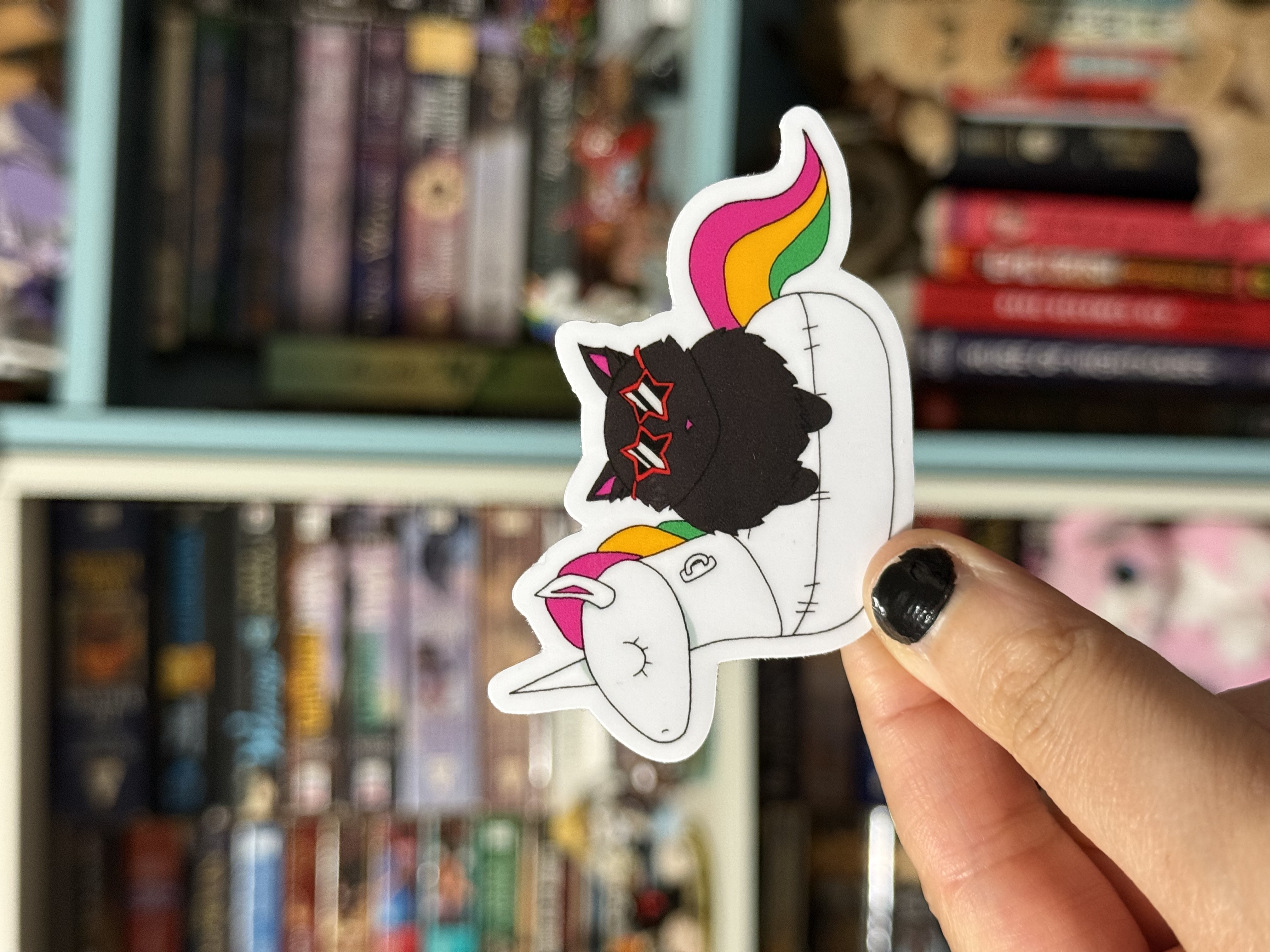 A 2x3 sticker of a fluffy back cat enjoying the summer time by riding a unicorn pool floaty.
